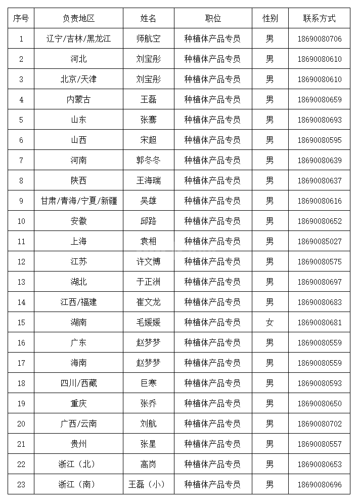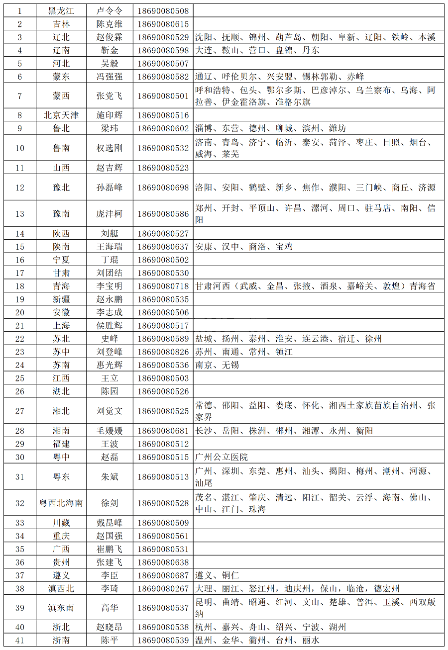 全国各片区销售经理联系方式