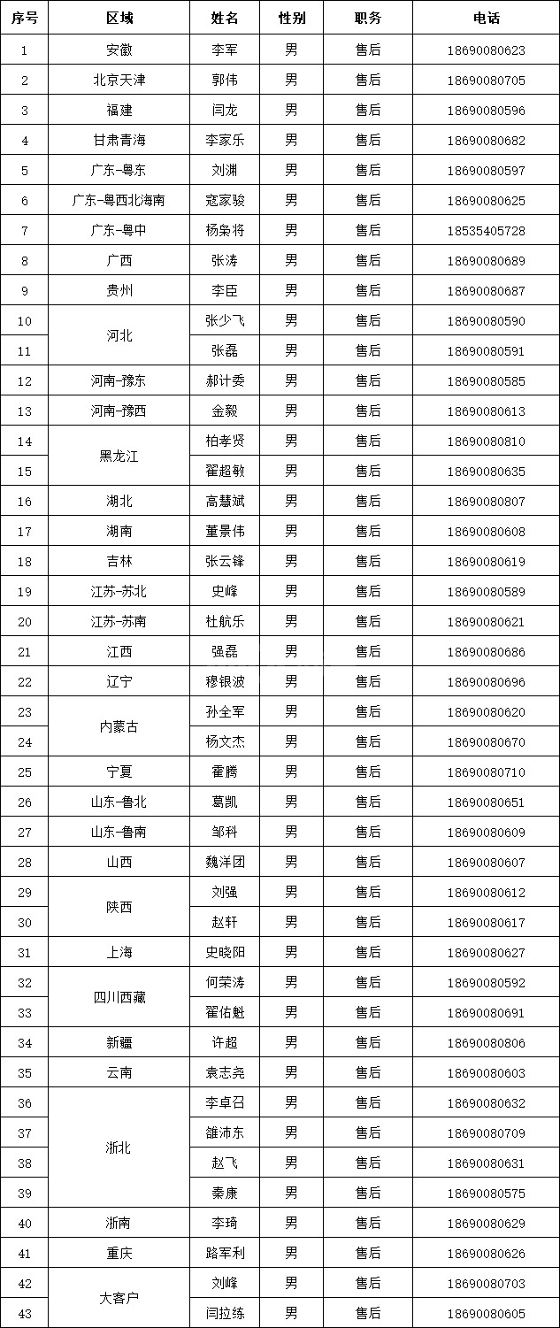 全国各片区售后工程师联系方式
